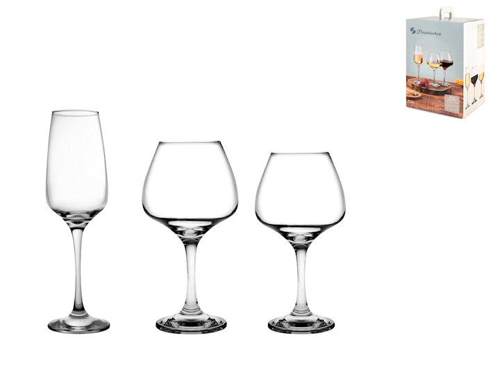 Servizio 18 calici risus in vetro trasparente. composto da 6 calici vino cl 39, 6 calici acqua 45,5 e 6 calici flute cl 19,5. adatti al lavaggio in lavastoviglie