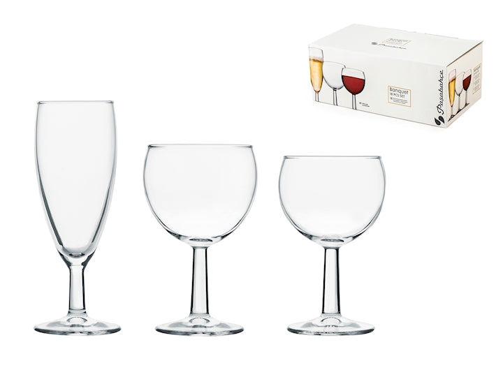 Servizio 18 calici banquet in vetro trasparente.servizio composto da 6 calici acqua cl 19,5 cm 8x13, 6 calici vino cl 15,2 cm 7x12, 6 calici flute cl 15,5 cm 5,5x16.